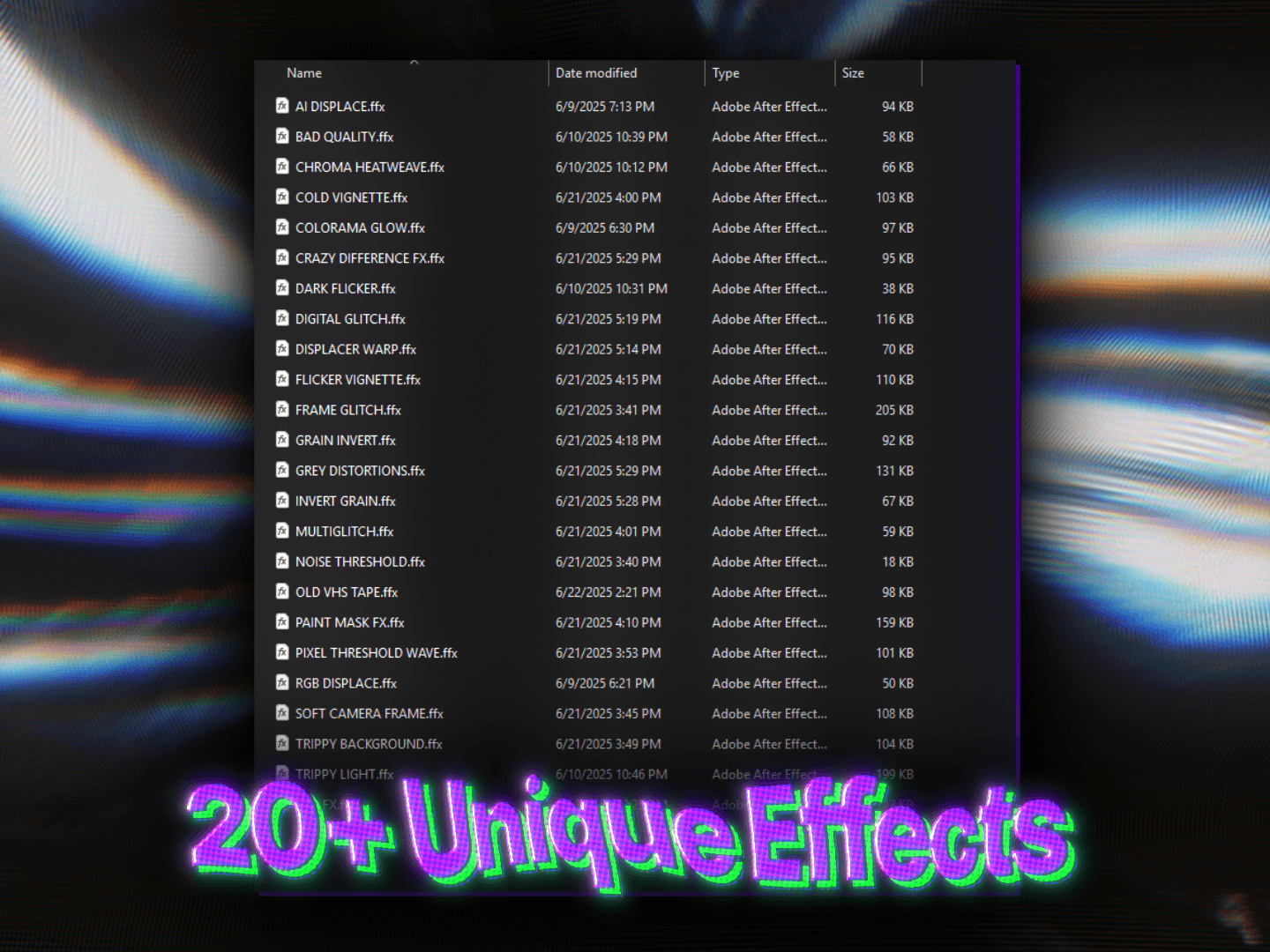 You get 20+ unique drag-and-drop effects for After Effects, built to add distortion, texture, flicker, overlays, warps, and high-impact stylization to your visuals.